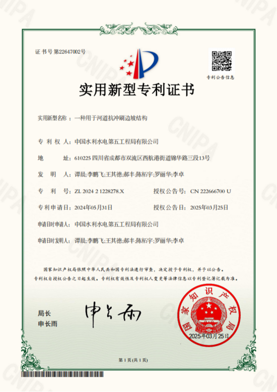 日前,從國家知識產權局獲悉,公司申報的《一種用于河道抗沖刷邊坡結構》實用新型專利獲正式授權。