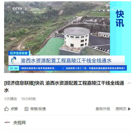 [經(jīng)濟信息聯(lián)播]快訊 渝西水資源配置工程嘉陵江干線全線通水