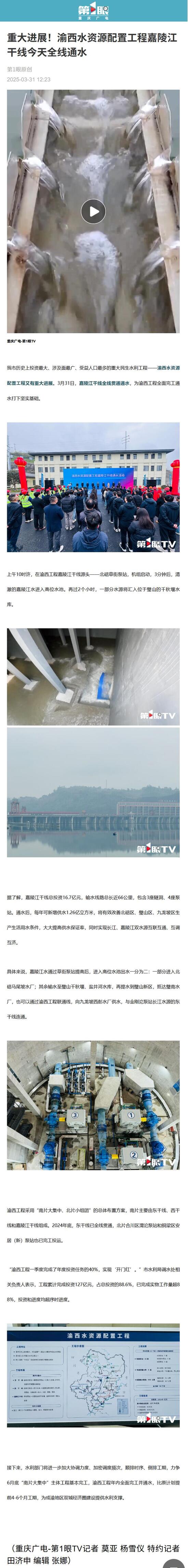 重慶廣電-第1眼TV? ?我市歷史上投資最大、涉及面最廣、受益人口最多的重大民生水利工程——渝西水資源配置工程又有重大進展。3月31日,嘉陵江干線全線貫通通水,為渝西工程全面完工通水打下堅實基礎(chǔ)。