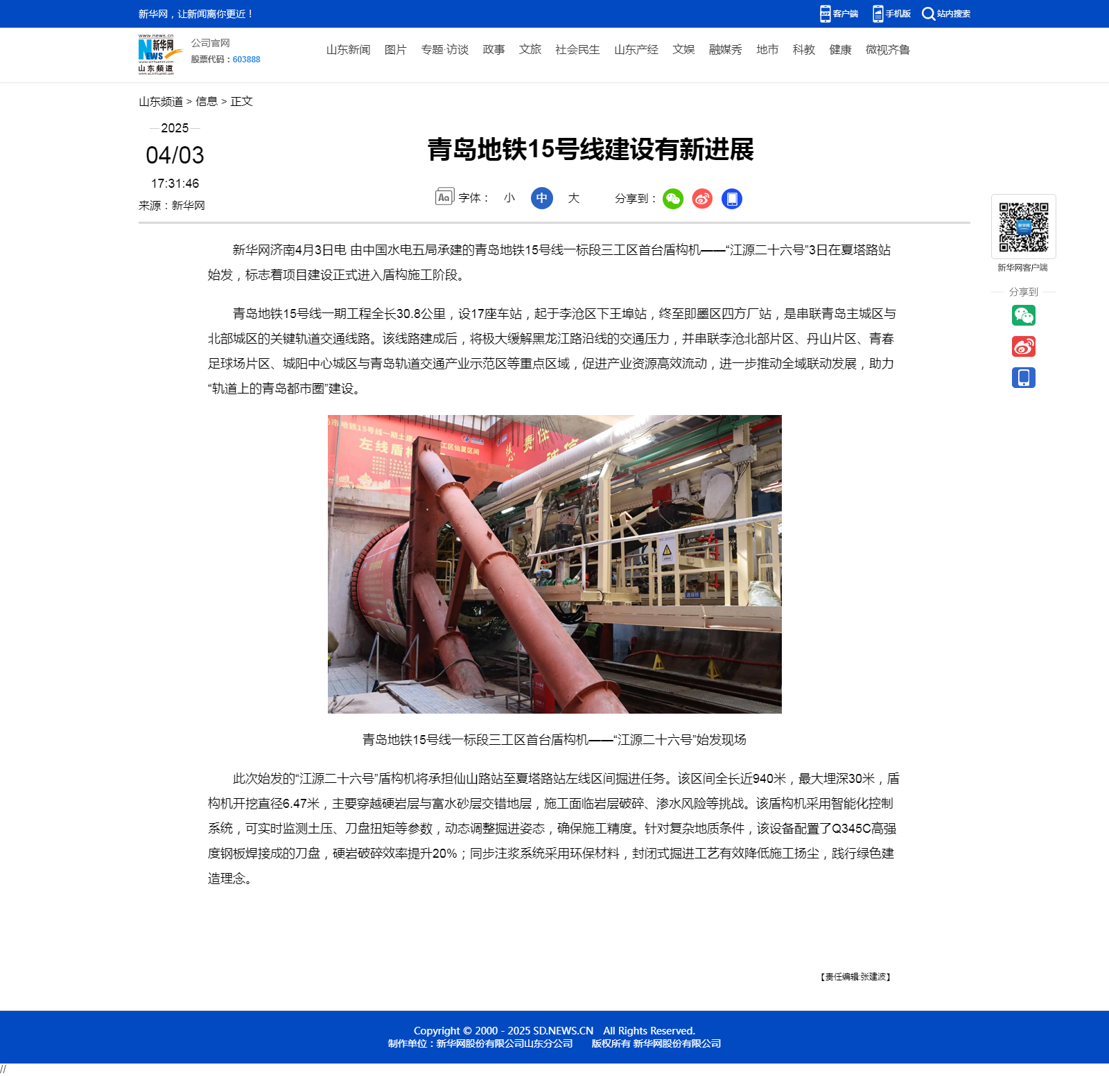 新華網(wǎng)濟(jì)南4月3日電 由中國水電五局承建的青島地鐵15號線一標(biāo)段三工區(qū)首臺盾構(gòu)機(jī)——“江源二十六號”3日在夏塔路站始發(fā),標(biāo)志著項目建設(shè)正式進(jìn)入盾構(gòu)施工階段。