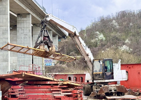 4月1日,塞爾維亞貝爾格萊德繞城公路奧-布項(xiàng)目現(xiàn)場,一臺挖機(jī)配備液壓蓮花抓木器正有序裝運(yùn)廢舊移動模架及鋼模臺車部件。隨著一車車廢鋼陸續(xù)駛離倉庫,項(xiàng)目通過優(yōu)化資源配置實(shí)現(xiàn)“變廢為利”,為降本增效注入新動能。